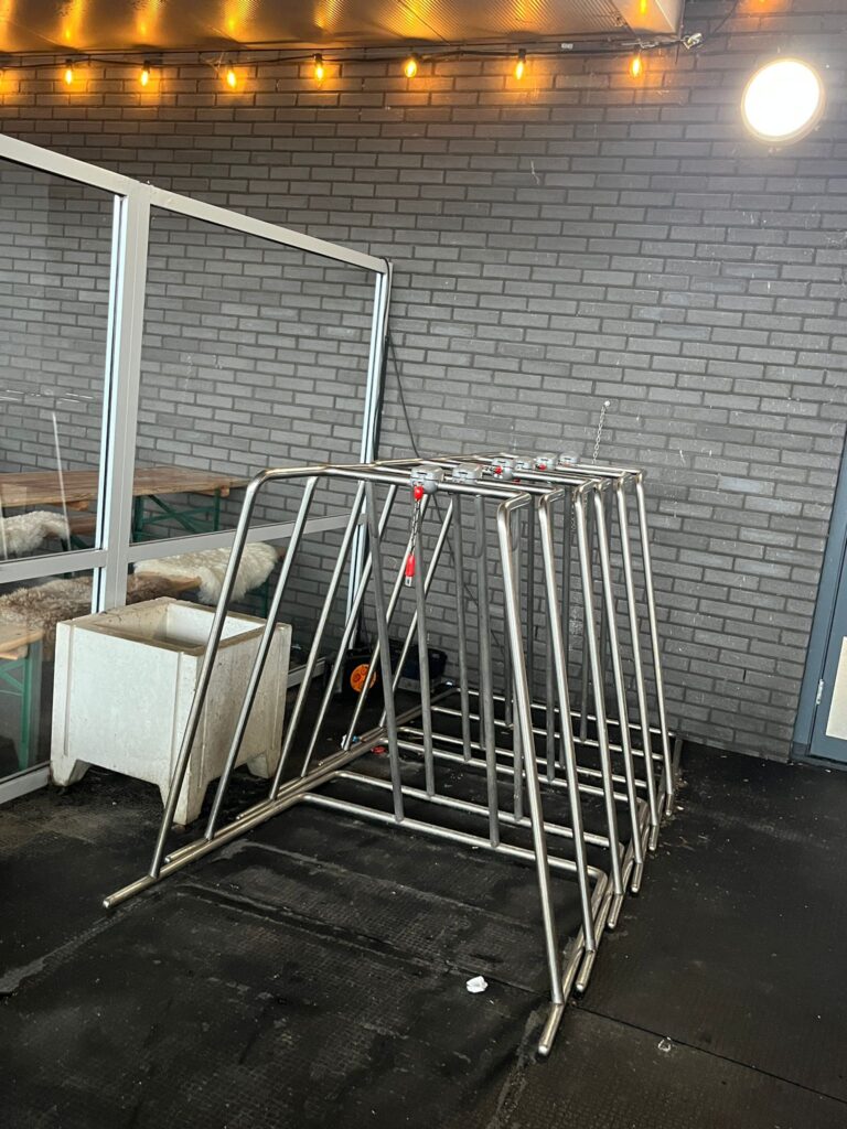 Deze schaatsframes staan bij Kleedkamer 5 en zijn te gebruiken met een winkelwagenmuntje of een muntje van 50 cent, 1 of 2 euro.